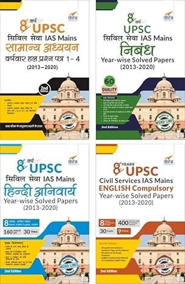 The thoroughly updated 2nd Edition of set of 4 Books - Disha's 8 Varsh UPSC Civil Services IAS Mains Year-wise Solved Papers (2013 - 2020) consists of Past 8 years solved papers of all the 7 Compulsory Papers – Qualifying Paper 1 (Compulsory English); Qualifying Paper 2 (Hindi Anivarya Hindi); Paper I (Nibandh); Papers II to V (Samanya Adhyayan Papers 1 to 4). • The USP of this book is that the word limit for each solution is strictly adhered as per the UPSC requirements. • Book 1 - Qualifying Paper 1 consists of Comprehension, Essays, Précis and Grammar Exercises. • Book 2 – Qualifying Paper 2 consists of Comprehension, Essays, Précis, Translation and Grammar Exercises. • Book 3 - Paper I consists of 60 Essays written in adherence to the Word Limits. • Book 4 - Paper II - V contains 500+ Questions in GS Papers 1 to 3, 105+ in GS Paper 4, thus a total of 600+ questions in all. • In all, the Combo contains solutions to 600+ GS Questions, 124 Essays (60 for Paper I & 32 for Qualifying Paper 1 & 2 each), 8 Reading English & Hindi Comprehension each, 400/ 160 English/ Hindi Grammar Questions, Translation & 9 Précis. • Each of the solution is thoroughly researched and written in a flawless language. • The book is also useful for all State PSC Exams.