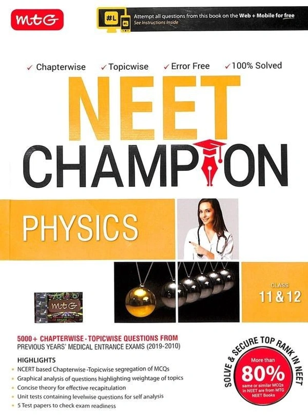 MTG NEET champion Physics is a 100% Solved question Bank of last 10 years’ (2019 – 2010) Physics question asked in various medical entrance exams. All the 10 years’ questions in this book have been segregated Chapter-wise and topic-wise (including AIIMS and JIPMER) to give a brief idea about the topic’s importance within the